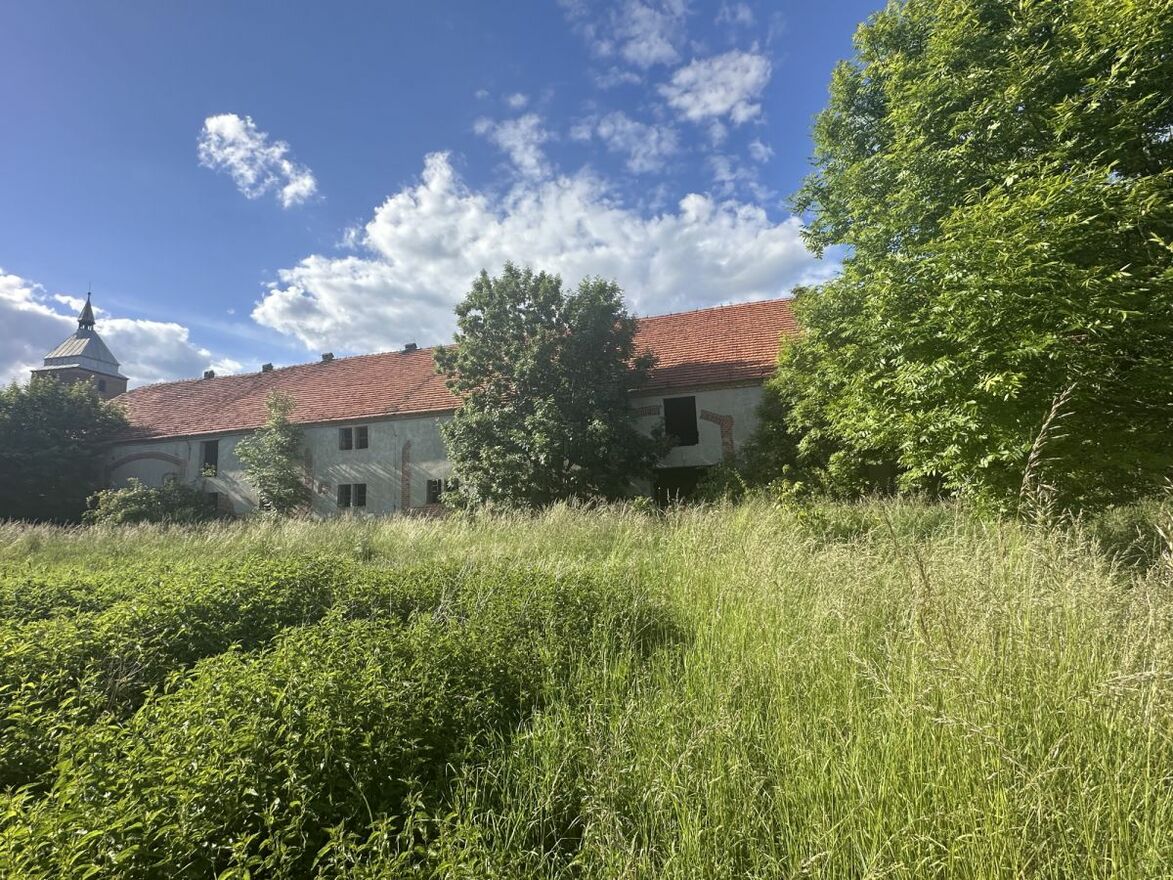 Grunt zabudowany jest budynkiem gospodarczym o pow. ok 1500 m2, piętrowym, murowanym. Dach dwuspadowy kryty dachówką.